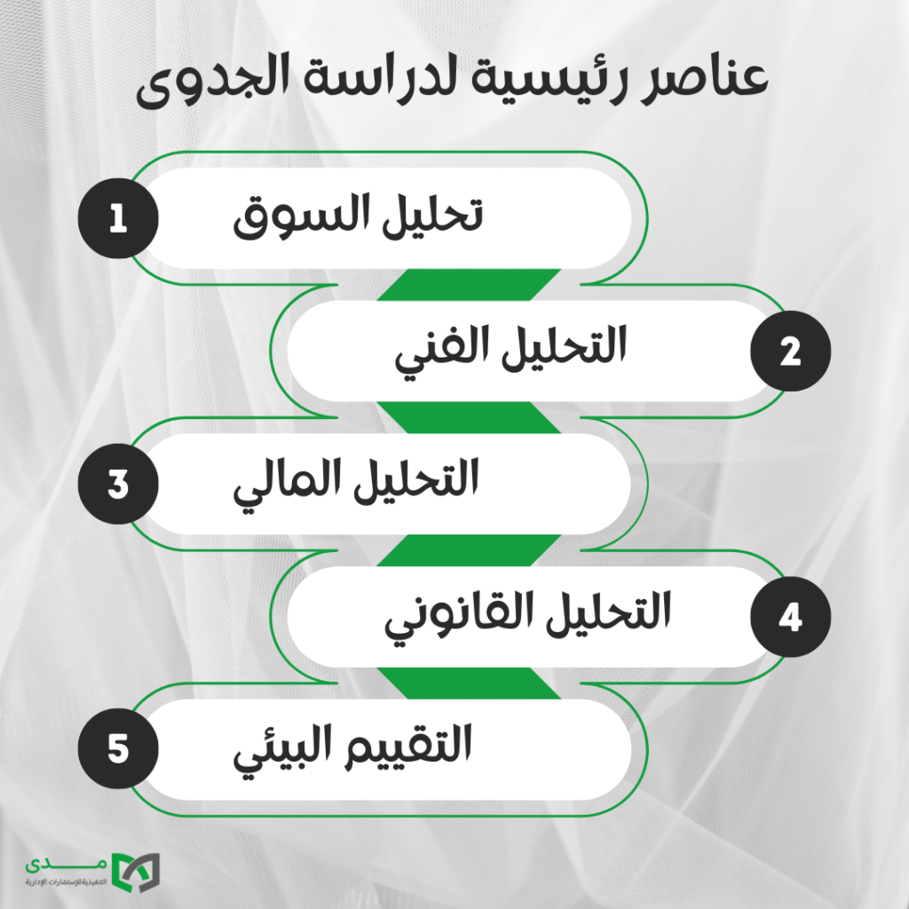 تشمل دراسة الجدوى عادةً عدة عناصر رئيسية، منها: